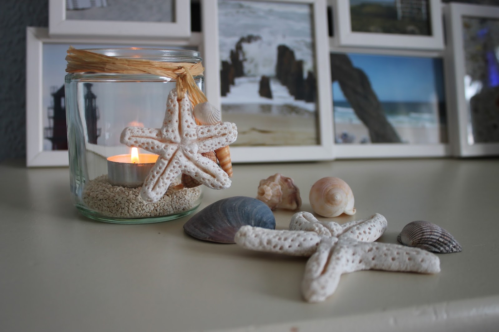... eine Spanschachtel blau angemalt und mit Heißkleber einen Seestern darauf festgeklebt.